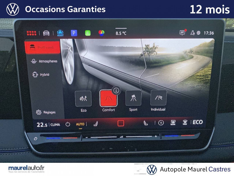 2 prises de chargement usb-c dans la console centrale ar, capacité de charge jusqu'à 45w / 2 prises usb-c à l'av, et prise 12 v dans la console centrale / 8 hp / airbag conducteur et passager av avec désactivation de l'airbag du passager av / airbags de tête pour passagers av/ar avec airbags latéraux av / airbags rideaux et latéraux av/ar, airbag central / allumage automatique des projecteurs avec feux de jour à led et fonction "coming/leaving home" / app-connect sans fil / appuie-tête à sécurité optimisée av / appui lombaire, réglage pneumatique des 2 côtés / assistant de freinage d'urgence front assist avec système de détection des piétons et cyclistes / assistant de maintien sur la voie lane assist / assistant d'intersection: système de surveillance périmétrique des intersections. ce système freine automatiquement le véhicule en cas d'urgence lors d'une intersection / avertissement de sortie de véhicule: lorsque le conducteur veut sortir du véhicule mais qu'un cycliste ou véhicule s'approche par derrière, le conducteur est averti (le témoin d'aide au changement de voie s'allume sur le rétroviseur, un signal sonore est émis et l'éclairage de la porte passe au rouge) / badge "ehybrid" sur le hayon à l'ar du véhicule / bandeau lumineux av/ar avec logo volkswagen rétroéclairé / banquette ar coulissante et dossier divisés, rabattables / blocs de feux ar à led 3d / boîte de vitesse automatique (dsg6) / boitiers des rétroviseurs extérieurs et poignées de porte dans la teinte du véhicule / câble de recharge pour borne domestique wallbox ou borne publique compatible (11kw) (mode 3, type 2/type 2) / câble de recharge pour prise de courant domestique (1,8 kw) (mode 2, type 2) / ciel de pavillon noir titane / climatisation "air care climatronic" 3 zones / commande vocale ida / contrôle de la traction (tcs) / détection d'angles morts "side assist" avec assistance de sortie de stationnement / déverrouillage à distance pour le dossier de banquette ar / dossier de siège passager av entièrement rabattable / double chargeur à induction / drive experience control: sélecteur de profil de conduite avec écran oled tactile - permet d'ajuster le volume, le profil de conduite ainsi que les "atmosphères" - appuyer sur le sélecteur pour afficher les profils de conduite, passez votre doigt sur l'écran tactile pour basculer sur le choix des "atmosphères" - des "atmosphères" sont déja paramétrées dans le véhicule mais vous pouvez créer vos propres atmosphères en définissant une playlist, un affichage digital cockpit, un éclairage d'ambiance, un niveau sonore et une tonalité / eclairage d'ambiance étendu à 30 couleurs / eclairage périmétrique avec projection de logo / ecrous antivol avec protection antivol étendue / feux de braquage et éclairage tous temps / frein de stationnement électronique y compris fonction auto hold / générateur de son à basse vitesse "e-sound" / interface bluetooth pour téléphone portable / interface téléphonique "comfort" avec fonction de chargement inductive pour 2 téléphones avec compartiment réfrigéré / jantes en alliage léger 19" "coventry" 8.5jx19", pneus 255/45 r19 / kit de crevaison - compresseur 12v et produit de colmatage des pneus / miroirs de courtoisie éclairés dans les pare-soleils / oeillets de retenue isofix pour sièges pour enfants sur sièges ar extérieurs et sur siège passager av, compatibles i-size / ouverture et fermeture du coffre mains-libres "easy open/easy close" / pack confort système de fermeture et de démarrage sans clé "keyless access," hayon électrique, alarme antivol avec protection volumétrique, park assist pro avec fonction mémoire / pack r-line extérieur / pédalier en acier inoxydable / pédalier en aluminium / peinture unie / plancher de coffre / prise 12v dans le coffre à bagages / projecteurs led plus (projecteurs à led avec feux de jour à led, feux antibrouillard intégrés, régulation des feux de route "light assist", éclairage statique d'intersection) / rampes de pavillon argent anodisées / rétroviseur intérieur à réglage jour/nuit automatique / rétroviseurs extérieurs à réglage, rabattement et dégivrage électriques, avec fonction mémoire / sellerie en tissu et microfleece "artvelours" / service d'appel d'urgence e-call / seuils de portes av en aluminium / siège conducteur ergoactive / sièges av avec réglage lombaire pneumatique quatre points / sièges av massant avec fonction massage et fonction de massage pneumatique par trois points de pression / sièges av sport avec appui-tête intégré / suppression siège passager rabattable / système de détection de la signalisation routière / système de suspension dcc pro: le contrôle électronique actif réagit en permanence a l'état de la route et à la situation de conduite et prend en compte la direction, le freinage et l'accélération - l'amortissement idéal est calculé pour chaque roue, et ajusté par les amortisseurs en quelques fractions de seconde. le conducteur a la possibilité de personnaliser le systeme dcc sur des réglages précis, de très confortable a très sportif - un confort de conduite optimal, une dynamique de conduite exceptionnelle et un sentiment de sécurité accru sur des chaussées en mauvais état / système navigation & infotainment "discover media" / tableau de bord digital cockpit 10" / tapis de sol en textile / trappe de recharge av gauche du véhicule / verrouillage centralisé, avec radiocommande et 2 clés pliantes / volant multifonction cuir avec palettes au volant