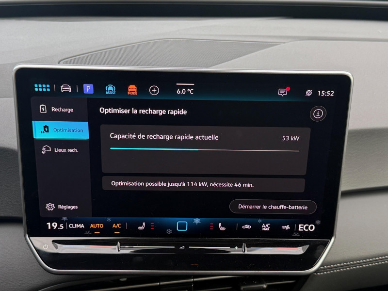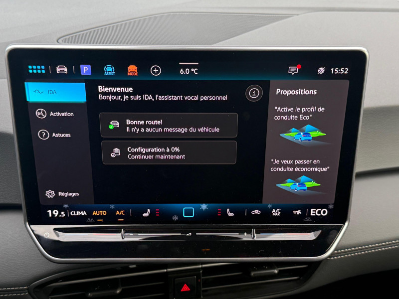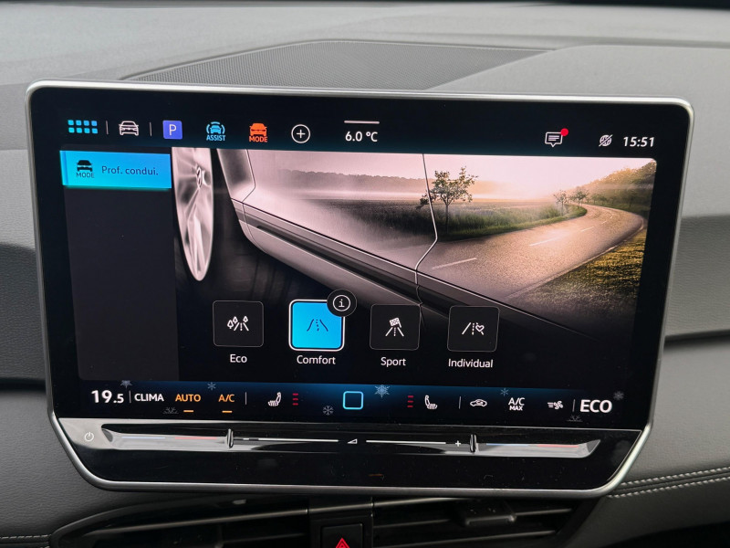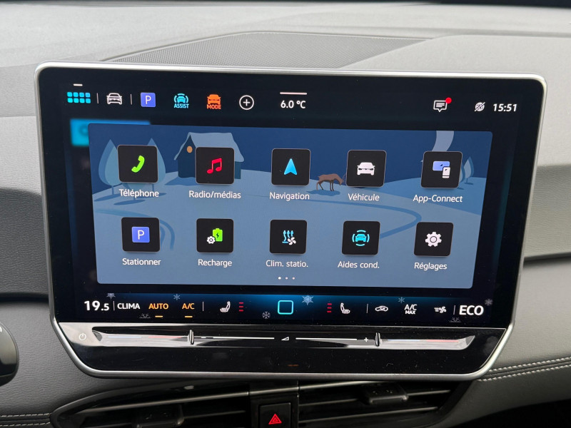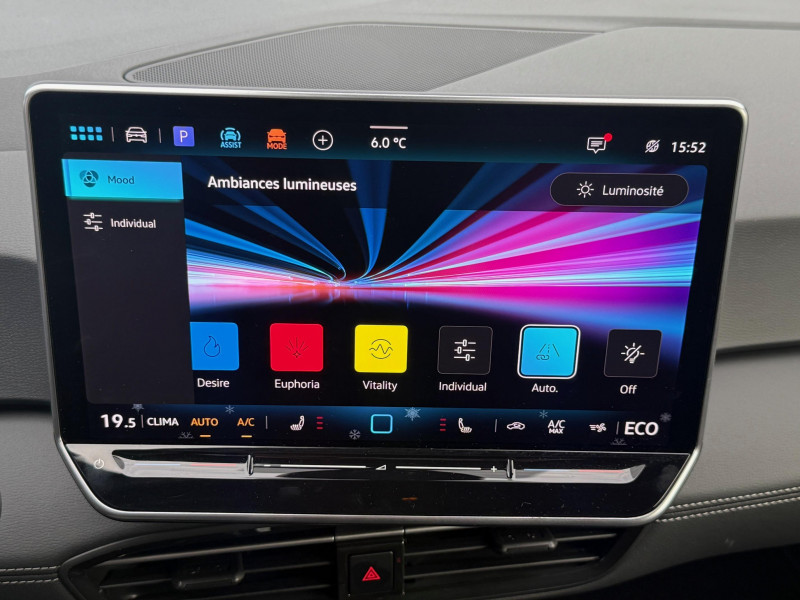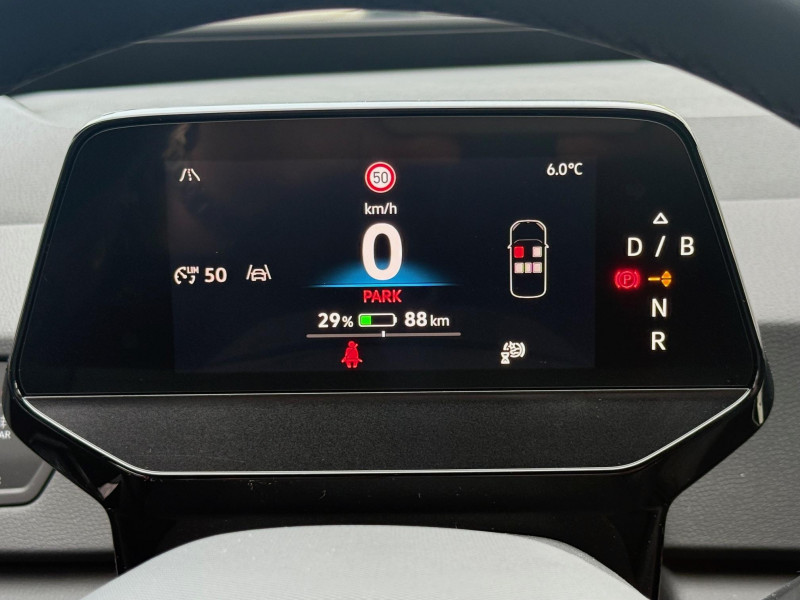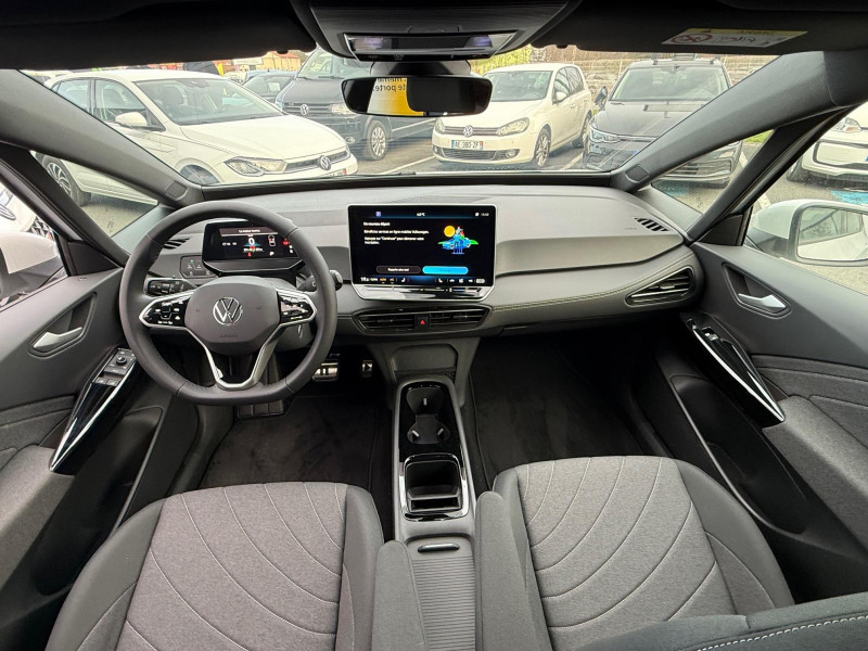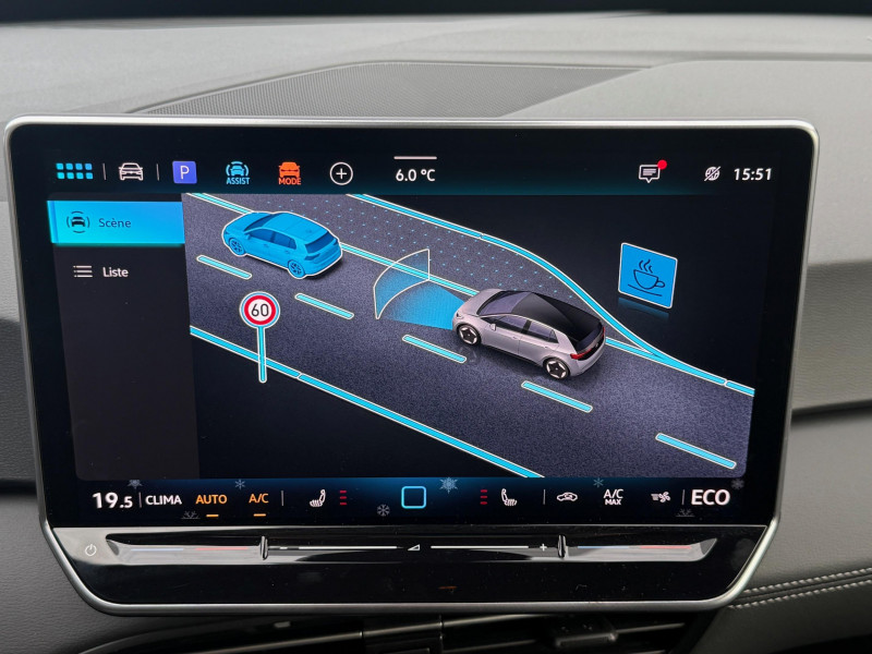 activation automatique du signal de détresse en cas de freinage d'urgence / allumage automatique des feux, capteurs de pluie avec essuie-glace automatique / buses à dégivrage automatique à l'av / climatisation stationnaire permet de réfrigérer, de ventiler ou de chauffer l'habitacle du véhicule à l'arrêt. elle permet également de dégivrer le pare-brise, de le désembuer et de le débarrasser d'une fine couche de neige en hiver. la climatisation stationnaire est alimentée par la prise de courant ou par la batterie haute tension du véhicule / eclairage à led de la plaque d'immatriculation ar / frein de stationnement électromécanique avec fonction d'immobilisation en pente "auto hold" la fonction auto hold garantit une immobilisation du véhicule sans déplacement intempestif, la pédale de frein ne devant pour cela pas être maintenue actionnée / id. display de 5,3'' l'id. display est un combiné d'instruments numérique doté d'un afficheur couleur tft à haute résolution. en plus du tachymètre numérique, il est possible d'afficher des informations supplémentaires provenant des systèmes d'aide à la conduite, par la sélection de divers profils d'information / intervention de freinage automatique lors des manoevres / jantes 18'' "east derry" bicolore argent pneumatiques 215/55 r18 / pack assistance système d'ouverture et de fermeture sans cléà distance 'keyless access advanced', caméra de recul 'rear view' située dans le logo volkswagen, intelligent park assist plus : système d'aide au stationnement av et ar, système proactif de protection des occupants - pre safe assist, alarme antivol - protection volumétrique et anti-soulèvement, Éclairage des poignées de portes / pack confort - volant multifonction, chauffant, avec commande tactile et capacitif - climatiseur 2-zones 'air care climatronic' avec filtre à charbon actif - sièges av chauffants - système de navigation & infotainment discover pro avec services de streaming et radio via internet, fonction planificateur d'itinéraire - interface téléphonique "confort" avec fonction de chargement inductive / pack extérieur projecteurs iq. light matrix led avec commutation automatique des feux de route, éclairage de mauvais temps et fonction de bienvenue, régulation dynamique des feux de route "dynamic light assist, bande lumineuse entre les projecteurs et le logo, feux ar à led avec clignotants séquentiels, vitres ar sur-teintées / park pilot - aide au stationnement av et ar / projecteurs led et feux ar à led / rétroviseur intérieur à réglage jour/nuit automatique / système d'aide à l'éco-conduite - eco assistance / système d'appel d'urgence - ecall appel d'urgence manuel ou automatique / système de freinage anti-multi collision ce dispositif freine automatiquement le véhicule après un premier choc afin de limiter le risque de multicollision / sélecteur de vitesse situéà droite derrière le volant avec frein de stationnement électronique il dispose d'une marche av (d/b), du neutre (n) et d'une marche ar (r). en position (d), la récupération d'énergie au freinage est en mode normal. en position (b), le système d'aide à l'éco-conduite est activé et la récupération d'énergie est plus élevée / 2 port usb-c à l'av (recharge et data) et 2 à l'ar (recharge) / 7 airbags airbags frontaux av conducteur et passager (airbag passager désactivable par clé), airbags latéraux à l'av, airbags interactif à l'av et avec airbags de tête av/ar, airbag central situé sur le côté droit du siège conducteur, permet la protection des chocs entre les occupants des sièges av en cas de collision latérale ou de retournement / acc: régulateur de vitesse adaptatif avec limiteur de vitesse adapte la vitesse en fonction des limitations de vitesse détectées / accoudoirs pour les sièges av / app-connect sans fil (en fonction du téléphone compatible) pour apple carplay, android auto et mirror link (avec fil) / avertissement de distance avec le véhicule précédent / avertisseur sonore 1 ton / avertisseur sonore et lumineux pour ceintures non attachées av et ar / banquette ar 3 places rabattable (2/3 - 1/3) avec trappe à skis / capacité de batterie nette - 59 kwh / capacité de puissance de recharge maximale sur prise ccs : 165 kw dc / capacité de puissance maximale du chargeur embarqué pour prise type 2 : 11 kw ac / car2x la fonction car2x utilise les informations des autres véhicules présents dans un périmètre pouvant s'étendre jusqu'à 800 mètres, ainsi que les signaux des infrastructures de transport pour avertir le conducteur et transmettre ces avertissements à d'autres véhicules équipés de la fonction car2x / carrosserie bicolore - toit et hayon noir / clignotants confort : (1) touche = (3) clignotements / commande vocale intuitive -"bonjour id." - certaines fonctions peuvent être exécutées grâce à la commande vocale / console centrale rétroéclairée avec rangements, volet occultant, 2 porte-gobelets / correcteur électronique de trajectoire esp, amplificateur de freinage d'urgence afu, servofrein électromécanique ebkv, freinage mixte bku, système d'antiblocage des roues abs, blocage électronique de différentiel eds,répartiteur électronique de freinage ebv,anti patinage électronique asr, régulateur électronique de couple msr et assistance au contre-braquage, programme électronique de stabilisation esc,système agissant comme un différenti.autobloquant électronique permettant une meilleure motricité en courbe grâce à une répartition optimale de la puissance et du couple sur les roues ar xds / câble de recharge mode 3 - type 2 pour borne de recharge (32 a) / direction électromécanique à assistance variable en fonction de la vitesse / détection de fatigue système de détection de fatigue du conducteur qui analyse le comportement du conducteur et recommande un temps de repos par l'apparition d'un message visuel et sonore / e-sound - son spécifi